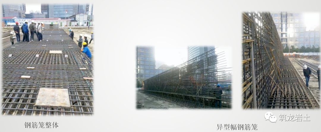 在钢筋笼下设时,对准槽段中心轴线,吊直扶稳,缓缓下沉,避免碰撞孔壁。下节钢筋笼下到孔口时,采用加强的槽钢将钢筋笼的加强顶部稳固住并架立在导墙上。然后起吊上节钢筋笼,竖直后,使上、下节各主筋一一对上,用U型卡扣进行连接。在钢筋笼接近至预定高程时,检查笼体平面位置,如超出标准,则进行调整。当钢筋笼下设到预定高程时,用槽钢将钢筋笼架立在导墙上,并用水准仪校准槽钢的顶面高程,确保在同一个水平面上。1、钢筋笼加工场地和制作平台应平整,分节制作的钢筋笼在同胎制作时应试拼装,采用焊接或机械连接,主筋接头搭接长度应满足设计要求,搭接位置应错开50%。三级钢及Φ25以上的二级钢应采用机械连接。 2、钢筋笼起吊桁架应根据钢筋笼起吊过程中的刚度及整体稳定性的计算结果确定。3、钢筋笼主筋交点应50%并应均匀分布点焊,主筋与桁架及吊点处应100%点焊。4、钢筋笼应设保护层垫板,纵向间距为3m~5m,横向设置2块~3块;定位垫板宜采用4mm~6mm厚钢板制作成“”型,与主筋焊接。1、吊车的选用应满足吊装高度及起重量的要求,主吊和副吊应根据计算确定。2、钢筋笼吊点布置应根据吊装工艺和计算确定,并应进行钢筋笼整体起吊的刚度等安全验算,按计算结果配置吊具、吊点加固钢筋和吊筋等。吊筋长度应根据实测导墙标高确定。3、钢筋笼起吊前应检查吊车回转半径600mm内无障碍物,并进行试吊。4、钢筋笼吊放时应对准槽段中心线缓慢沉入,不得强行入槽。5、钢筋笼的迎土面及迎坑面朝向应正确放置,严禁反放。7、异形槽段钢筋笼起吊前应对转角处进行加强处理,并随入槽过程逐渐割除。