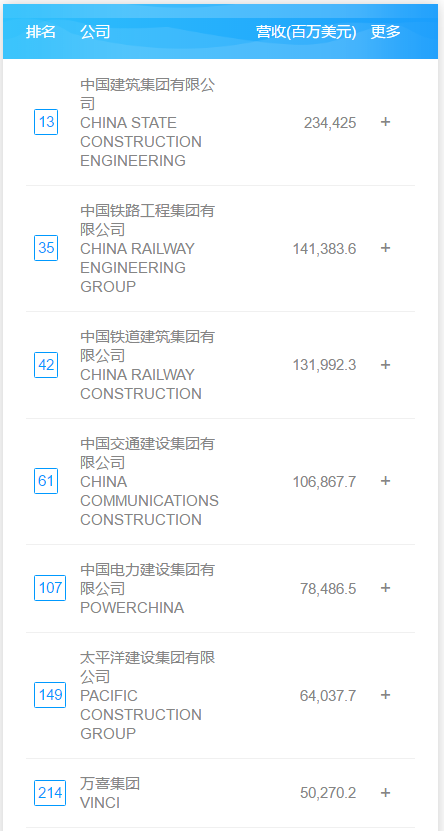 财富Plus APP于北京时间8月2日与全球同步发布了最新的《财富》世界500强排行榜,中国共有143家公司上榜,其中工程与建筑行业有10家中国企业上榜: