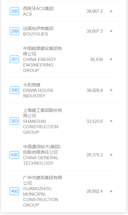 此次上榜的中国建企中,中国建筑集团有限公司以约2344亿美元的年营收位列世界500强第13位,顶端排名再创新的高度。值得一提的是,广州市建筑集团有限公司系首次登上榜单,排名第460位。