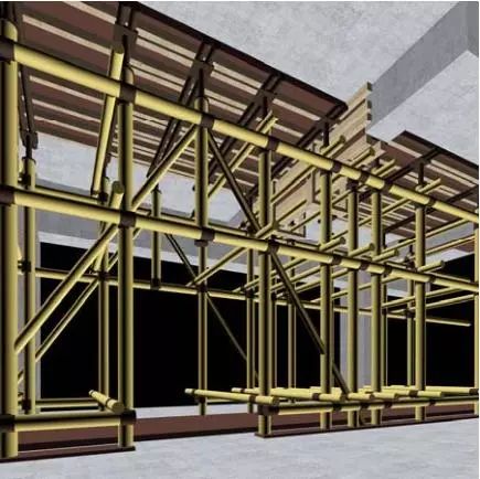 这个图片看得比较清楚,水平杆是分开的,而且是错开设置的。后浇带设置独立的剪刀撑,梁板模板剪刀撑单独设置,拆模时,将灰色支撑拆掉,保留黄色支撑就可以了!