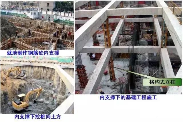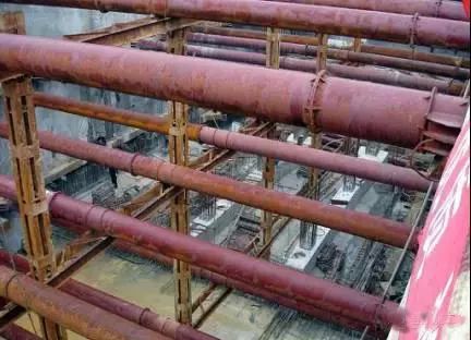 当基坑深度较大,悬臂式挡墙的强度和变形无法满足要求、坑外锚拉可靠性低时,则可在坑内采用内撑支护。它适用于各种地基土层,缺点是内支撑会占用一定的施工空间。常用有钢管内撑支护和钢筋砼构架内撑支护。