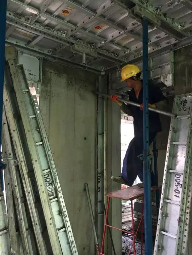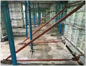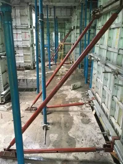 除了外墙、电梯井等部位,所有内墙要求按照1.5m~1.8m的间距打满斜撑,同一面内墙必须两边都打上斜撑,保证垂直度。
