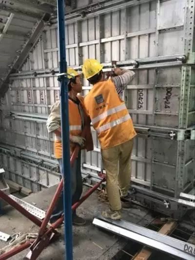 拼装过程中需要利用水平仪实时调整墙体模板垂直度及平整度。