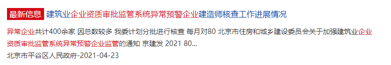 根据北京市《关于加强建筑业企业资质审批监管系统异常预警企业监管的通知》(京建发〔2021〕80号)文件要求,在资质审批系统中增加了异常预警功能。通过与注册建造师系统自动比对,企业注册建造师不满足相应资质标准时,系统即进行预警。