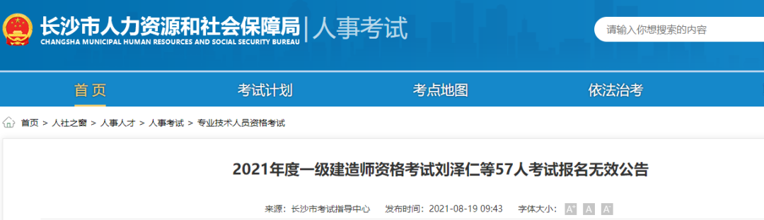 8月19日,长沙市人社局发布《2021年度一级建造师资格考试刘泽仁等57人考试报名无效公告》。