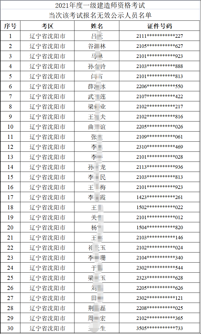 附件:2021年度一级建造师资格考试当次该考试报名无效公示人员名单