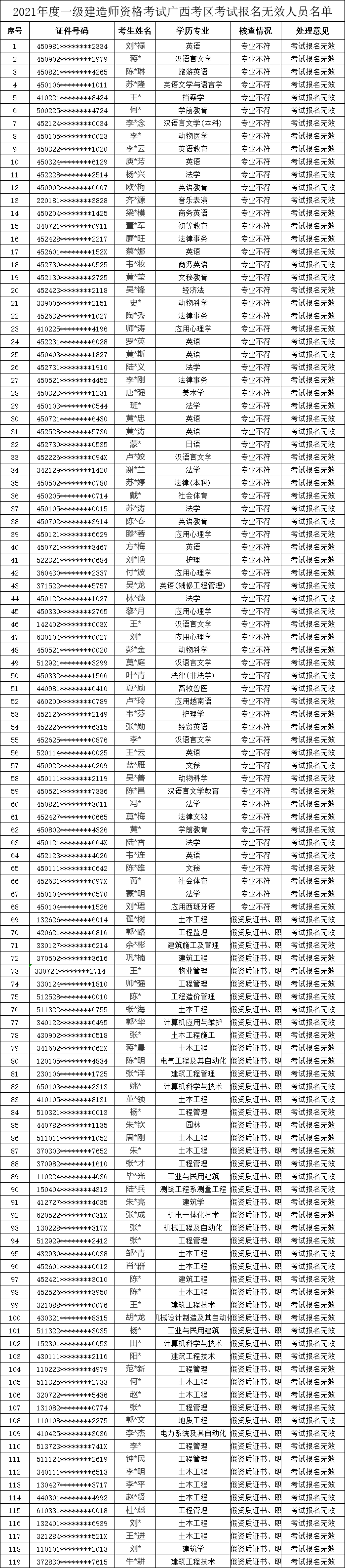 广西119人报名作废,作废理由包括填写的所学专业与本次考试允许报名专业不符或提供虚假资质证书、职称证书等不实承诺行为