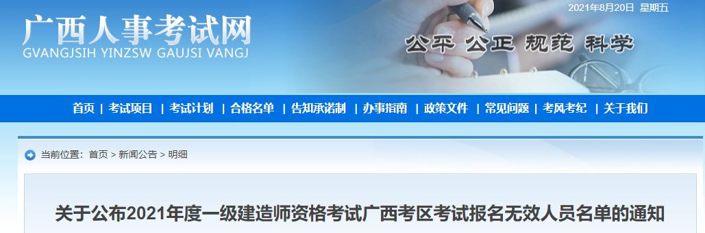 8月17日,广西人事考试网发布《关于公布2021年度一级建造师资格考试广西考区考试报名无效人员名单的通知》。