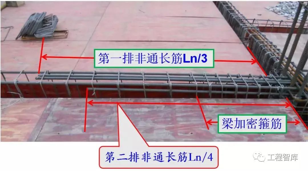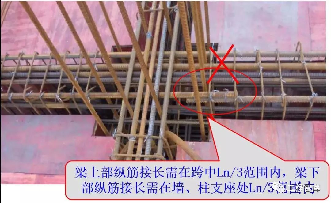 梁上部纵筋接长需在跨中Ln/3范围内,梁下部纵筋接长须在墙、柱支座处Ln/3范围内。