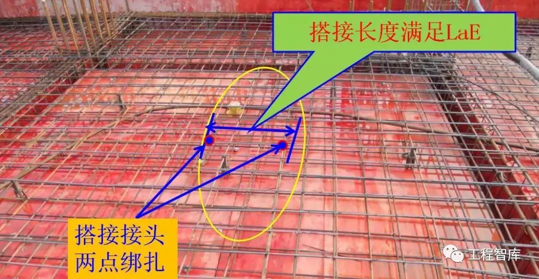 楼板的下部钢筋在梁支座内搭接,板的上部钢筋在板中搭接。搭接接头保证两点绑扎。