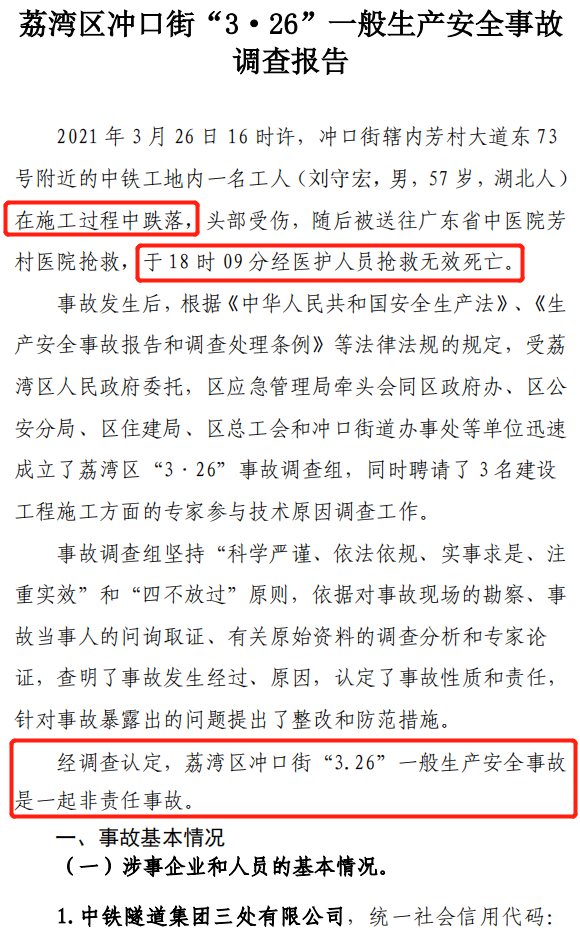 广州市荔湾区人民政府发布了《荔湾区冲口街“3•26”一般生产安全事故调查报告》,经调查认定,各参建单位履职到位,本次生产安全事故为非责任事故。