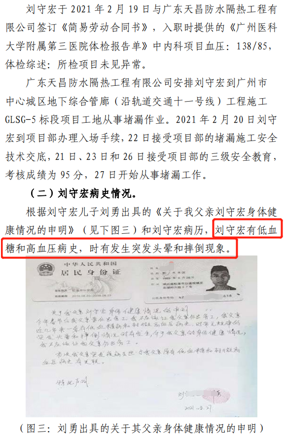 刘某宏带病上班开展隧道注浆辅助性作业,在出现身体不适后摔倒头部受伤并经抢救无效死亡。