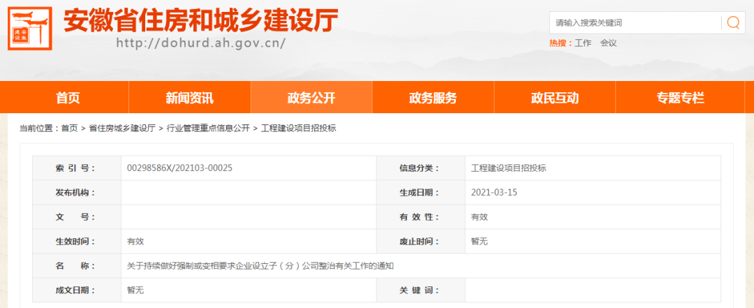 2021年3月,安徽省住建厅发布《关于持续做好强制或变相要求企业设立子(分)公司整治有关工作的通知》,要求:推进统一开放市场建设,持续排查整治设置建筑市场壁垒、强制或变相要求中标企业设立分(子)公司、限制和排斥建筑业企业跨地区承揽业务等行为。