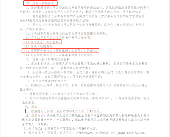 尽管云南路建集团8月13日才被裁定受理破产重整,但招募重整投资人节奏快,行动迅速,报名仅截至9月15日。