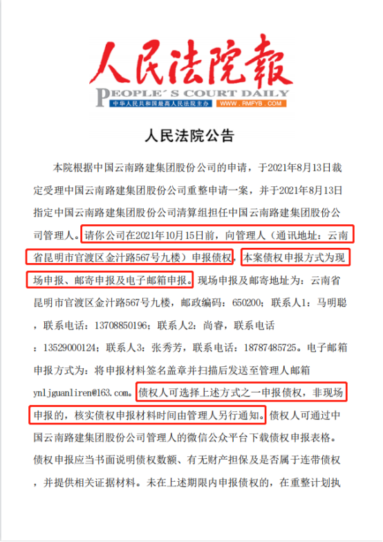 2021年8月13日,云南省昆明市中级人民法院裁定受理该重整申请一案,并于8月13日指定中国云南路建集团股份公司清算组担任中国云南路建集团股份公司管理人。