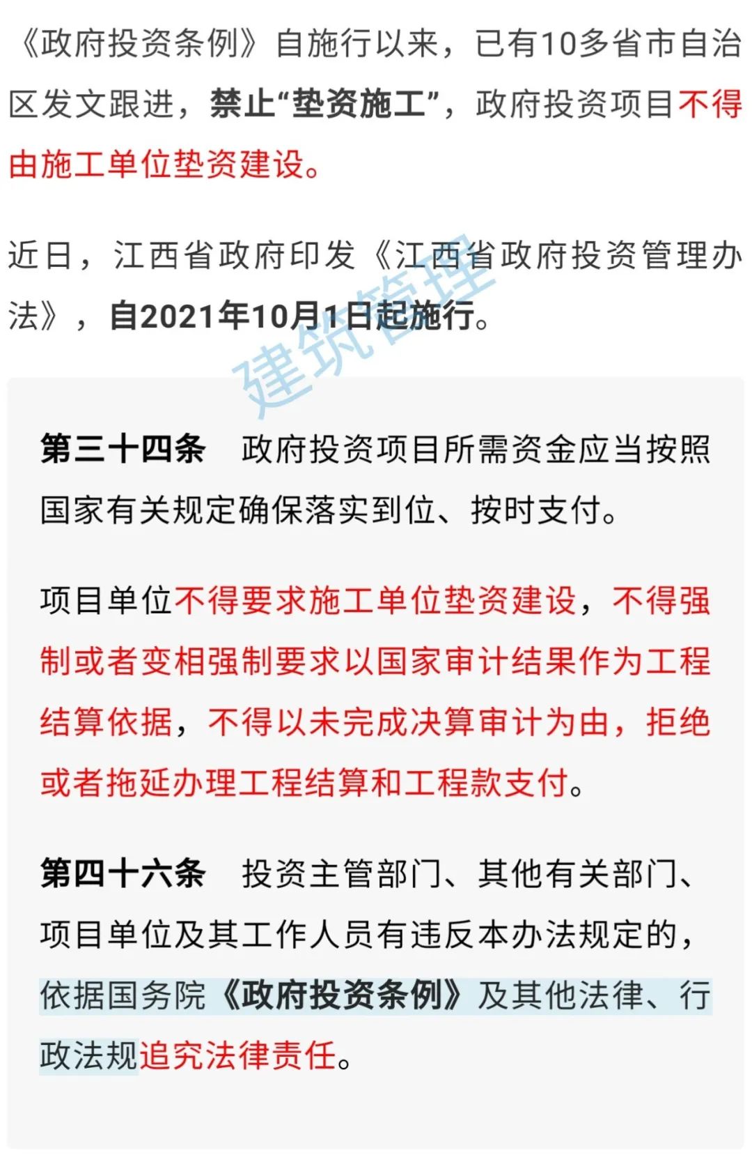 1、禁止“垫资施工”:政府投资项目不得由施工单位垫资建设。