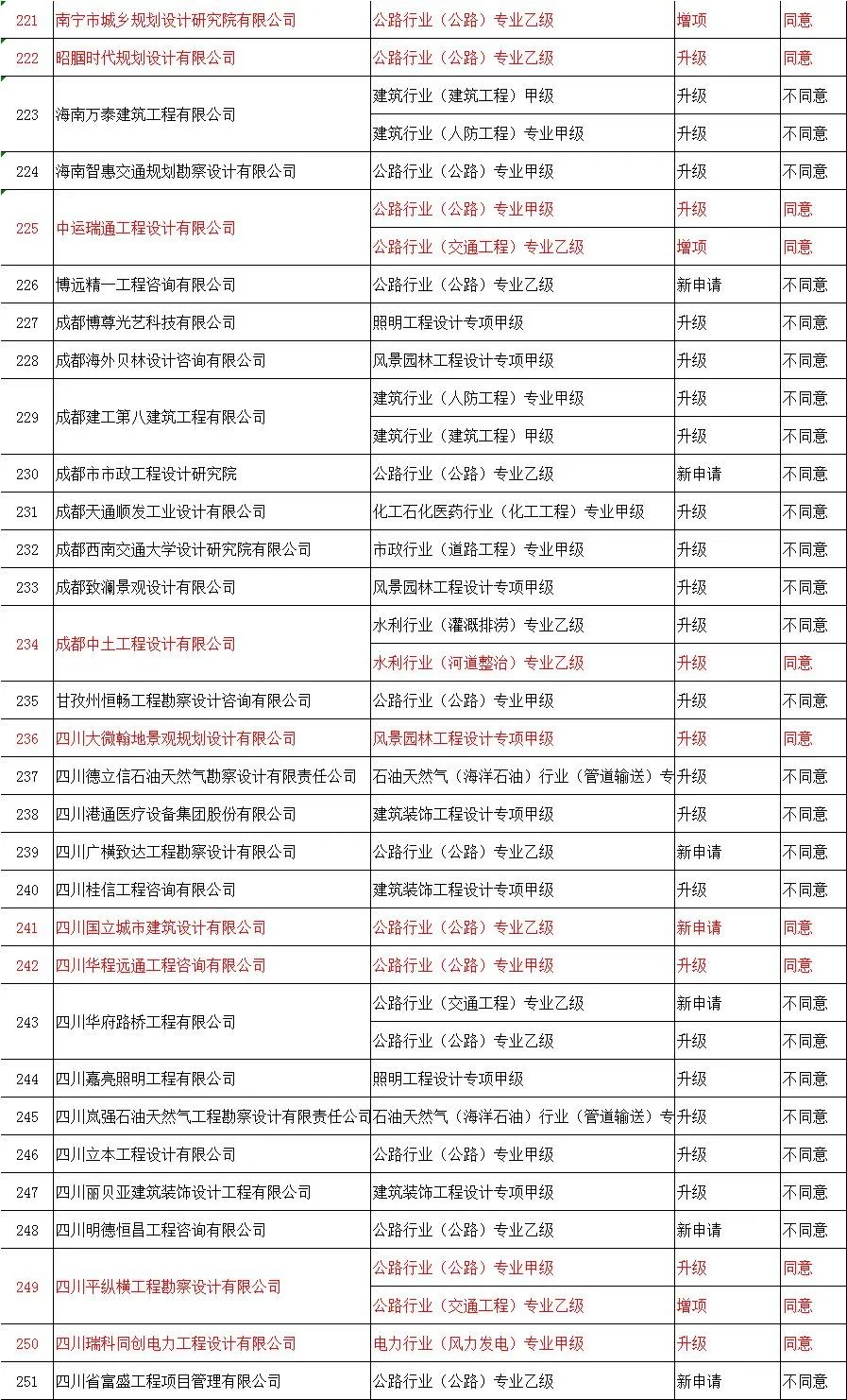 | 275 | 四川圣宏基建筑工程有限公司 | 公路工程施工总承包壹级 | 升级 | 不同意 |