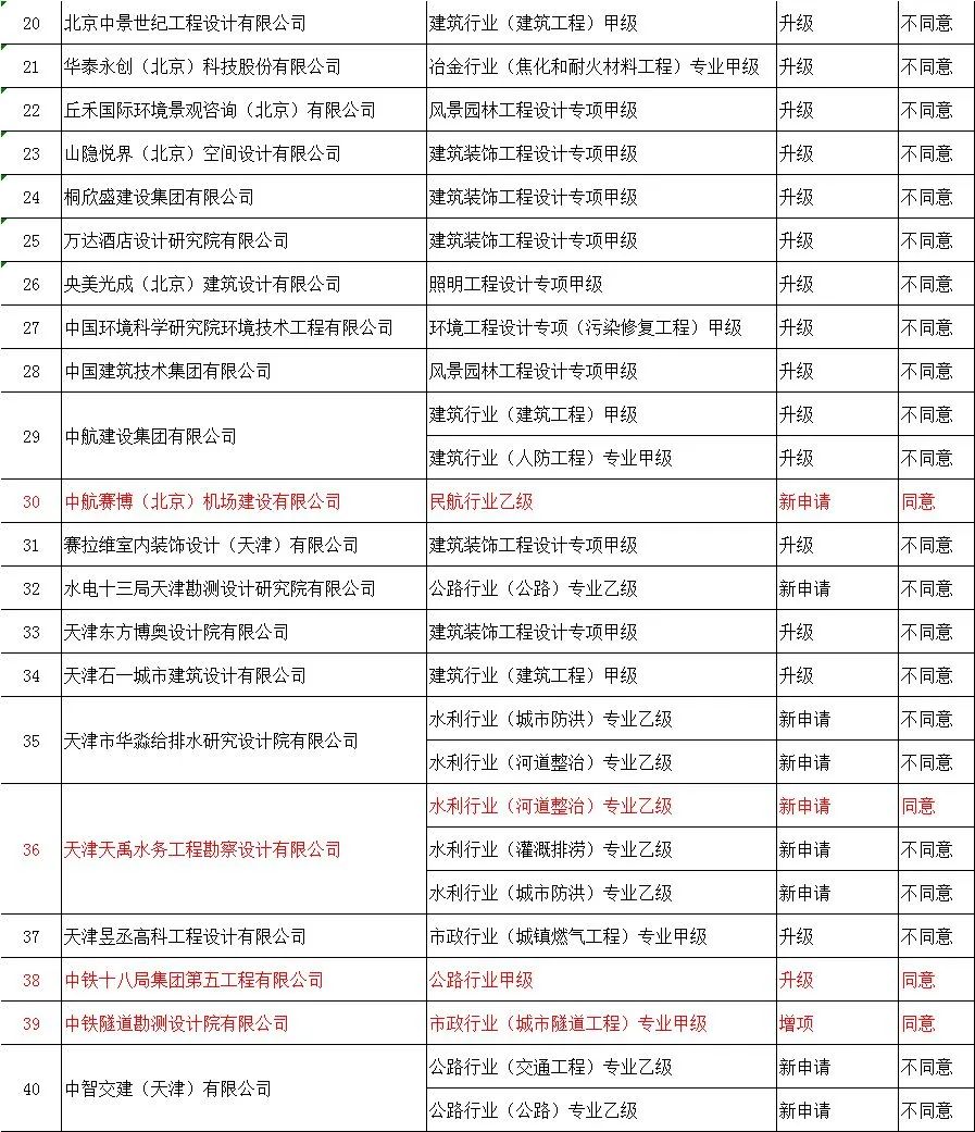 | 21 | 天津中璟建设工程有限公司 | 机场场道工程专业承包贰级 | 新申请 | 不同意 |