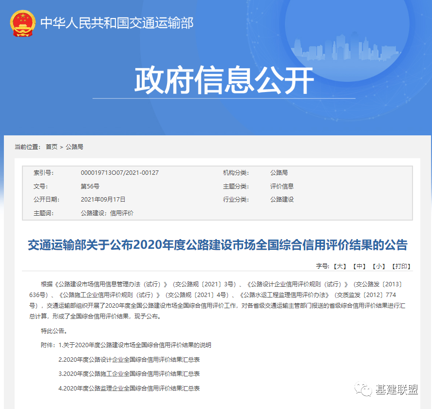 根据《公路建设市场信用信息管理办法(试行)》(交公路规〔2021〕3号)、《公路设计企业信用评价规则(试行)》(交公路发〔2013〕636号)、《公路施工企业信用评价规则(试行)》(交公路规〔2021〕4号)、《公路水运工程监理信用评价办法》(交质监发〔2012〕774号),交通运输部组织开展了2020年度全国公路建设市场全国综合信用评价工作,对各省级交通运输主管部门报送的省级综合信用评价结果进行汇总计算,形成了全国综合信用评价结果,现予公布。