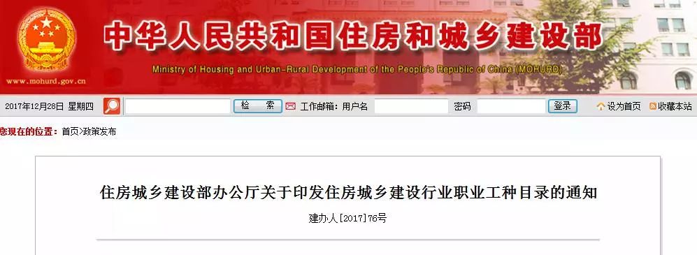 为贯彻落实《中共中央 国务院关于印发<新时期产业工人队伍建设改革方案>的通知》和中央城市工作会议精神,健全住房城乡建设行业职业技能培训体系,全面提高住房城乡建设行业一线从业人员素质和技能水平,我部结合各地培训需求,制定了《住房城乡建设行业职业工种目录》,在原有《建筑业职业工种名称》的基础上,将市政、安装、园林绿化、燃气、供水排水、环卫、房地产物业管理及装配式建筑等住房城乡建设行业各领域的职业工种进行统一编码,用于指导各地开展技能培训。