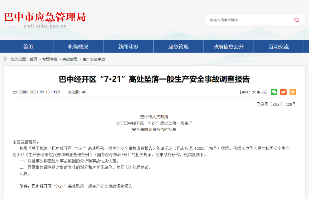 巴中市应急管理局发布巴中经开区“7·21”高处坠落一般生产安全事故调查报告: