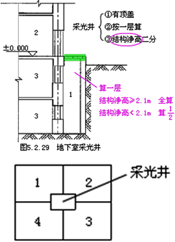 5、地下室、半地下室应按其结构外围水平面积计算。结构层高在2.20m及以上的,应计算全面积;结构层高在2.20m以下的,应计算1/2面积。