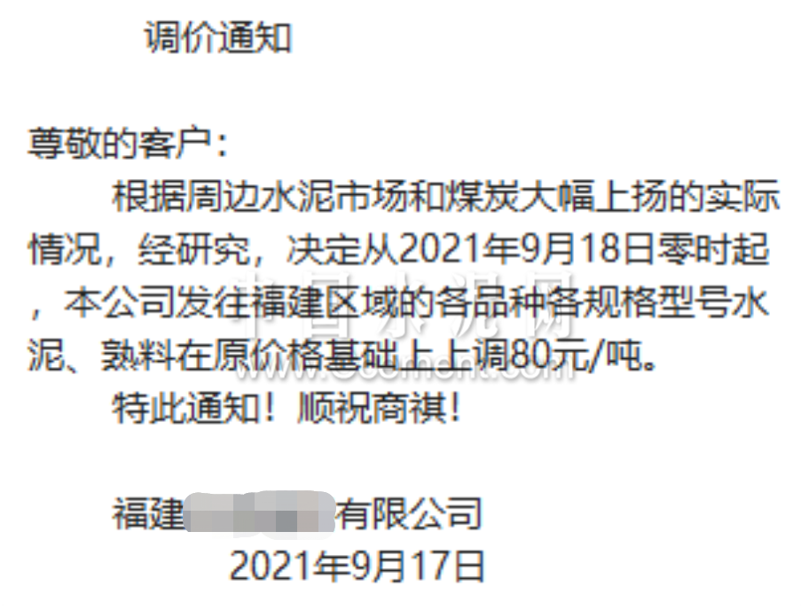 据市场反馈,福建当地主流水泥企业自9月18日起上调水泥、熟料价格80元/吨。
