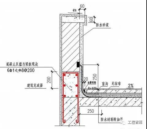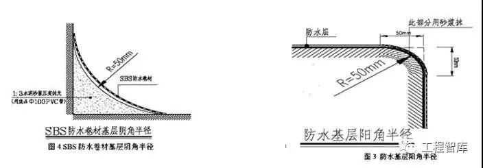 沥青防水卷材的圆弧半径应在100~150mm,高聚物改性沥青防水卷材的圆弧半径应50mm,合成高分子防水卷材的圆弧半径应在20mm。