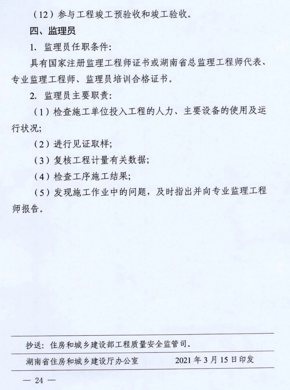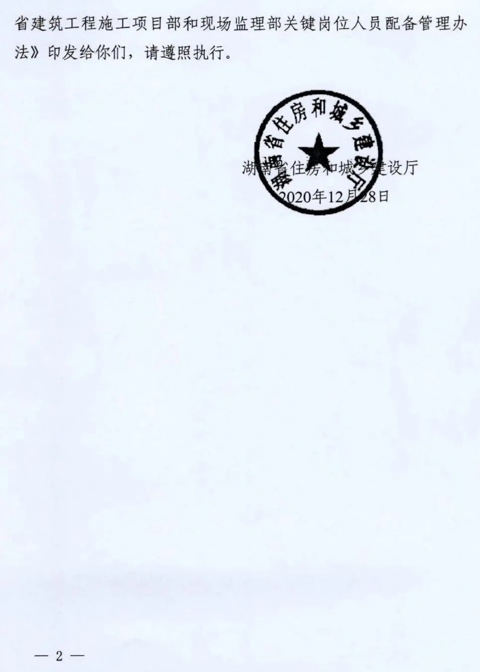 湖南省住建厅发布《湖南省建筑工程施工项目部和现场监理部关键岗位人员配备管理办法》,自2021年3月15日起实施。