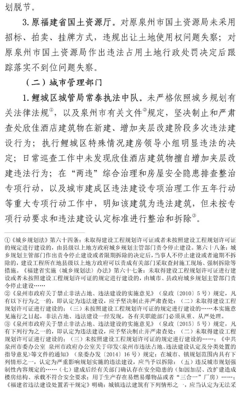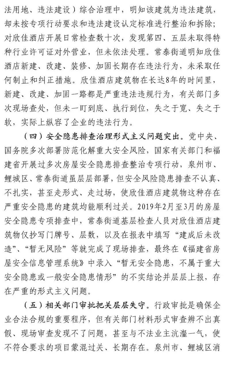 泉州市各级住建部门对建筑活动和工程质量负有监管主体责任,但对于欣佳酒店建筑的长期违法违规行为从未发现和查处。