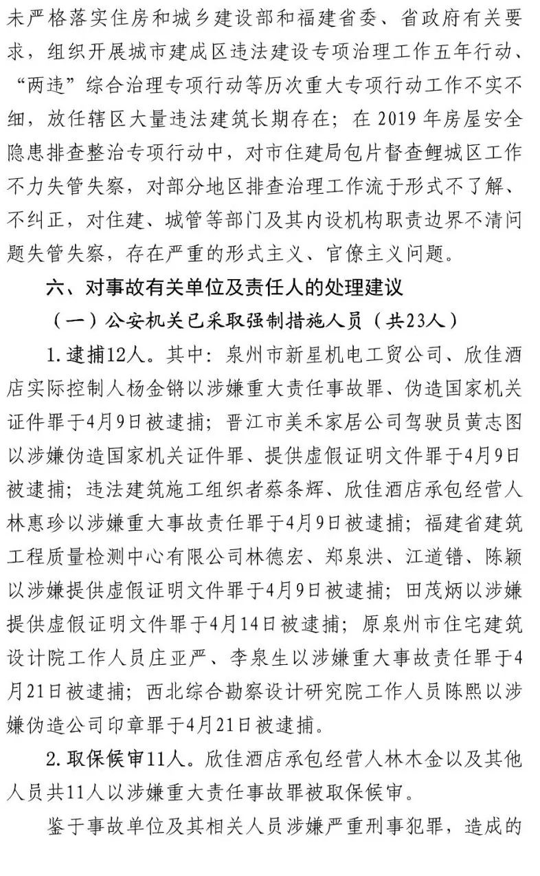 泉州市新星机电工贸有限公司法定代表人杨金锵、泉州市广鑫建设工程公司法定代表人蔡条辉等23名相关责任人员被公安机关依法立案侦查并采取刑事强制措施。