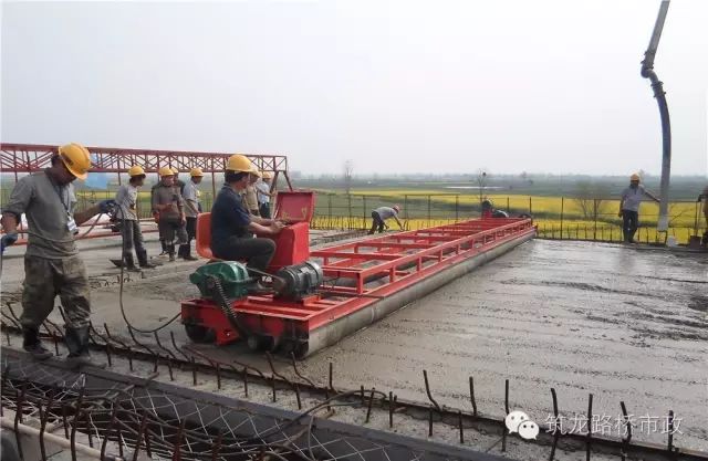 采用振动棒配合三辊轴摊铺机施工,以一联为作业单元进行施工,每个施工循环长度为10米左右,混凝土布料后采用振动棒初振一遍,三滚轴摊铺机施工时,采用前进振动,后退静滚的工艺,振动和静滚交叉进行,振动2-3遍,然后将振动轴提离标高带,前后静滚至平整度符合要求然后用3M刮尺饰面,每次饰面间隔约为30min,刮平饰面不少于3遍,并设专人检查迟杆与面层的接触情况。然后拆除轨道槽钢,用人工将轨道槽填满,木抹子人工找平,最后用铁抹压光成型。