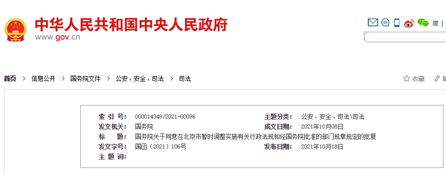 国务院关于同意在北京市暂时调整实施有关行政法规和经国务院批准的部门规章规定的批复