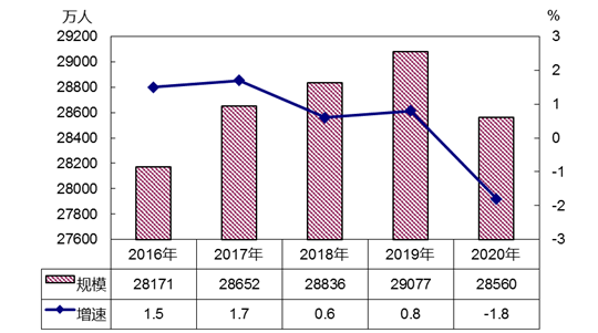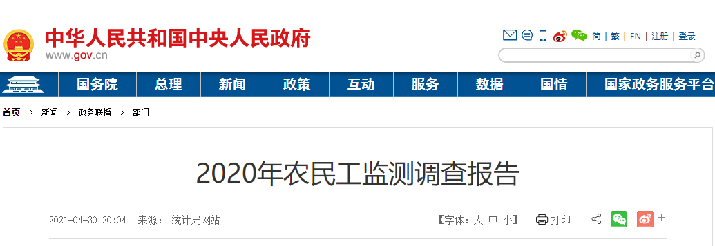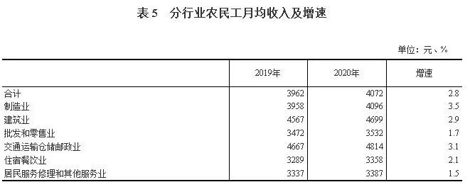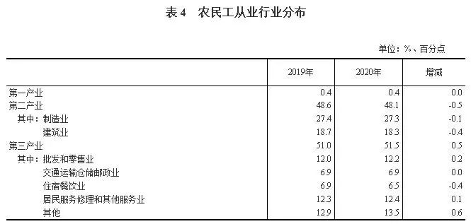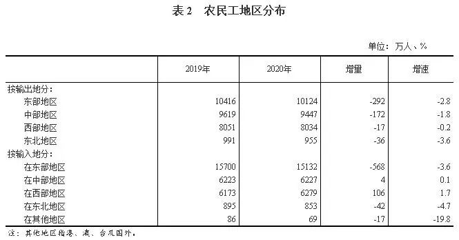 2020年,各地区各部门坚决贯彻党中央决策部署,统筹疫情防控和经济社会发展,有序推进复工复产,扎实做好“六稳”工作,全面落实“六保”任务,各项稳就业政策不断落实落地,国民经济持续稳定恢复,农民工就业保持总体稳定。2020年全国农民工总量28560万人,比上年减少517万人,下降1.8%,规模为上年的98.2%。其中,外出农民工16959万人,比上年减少466万人,下降2.7%;本地农民工11601万人,比上年减少51万人,下降0.4%。在外出农民工中,年末在城镇居住的进城农民工13101万人,比上年减少399万人,下降3.0%。在外出农民工中,跨省流动农民工7052万人,比上年减少456万人,下降6.1%;在省内就业的外出农民工9907万人,比上年减少10万人,与上年基本持平。省内就业农民工占外出农民工的比重为58.4%,比上年提高1.5个百分点。分区域看,东部、中部、西部和东北地区省内就业农民工占外出农民工的比重分别比上年提高1.6、1.3、1.8和1.0个百分点。(二)东部地区输出农民工人数减少最多,占到减少总量的一半以上从输出地看,东部地区输出农民工10124万人,比上年减少292万人,下降2.8%,占农民工总量的35.4%;中部地区输出农民工9447万人,比上年减少172万人,下降1.8%,占农民工总量的33.1%;西部地区输出农民工8034万人,比上年减少17万人,下降0.2%,占农民工总量的28.1%;东北地区输出农民工955万人,比上年减少36万人,下降3.6%,占农民工总量的3.3%。东部地区农民工减少量占到全国农民工减少总量的56.5%。(三)在东部地区务工人数减少最多,中西部地区吸纳就业的农民工继续增加从输入地看,在东部地区就业的农民工15132万人,比上年减少568万人,下降3.6%,占农民工总量的53%。其中,在京津冀地区就业的农民工2076万人,比上年减少132万人,下降6.0%;在江浙沪地区就业的农民工5179万人,比上年减少212万人,下降3.9%;在珠三角地区就业的农民工4223万人,比上年减少195万人,下降4.4%。在中部地区就业农民工6227万人,比上年增加4万人,与上年基本持平,占农民工总量的21.8%。在西部地区就业农民工6279万人,比上年增加106万人,增长1.7%,占农民工总量的22.0%。在东北地区就业农民工853万人,比上年减少42万人,下降4.7%,占农民工总量的3.0%。在全部农民工中,男性占65.2%,女性占34.8%。女性占比比上年下降0.3个百分点。其中,外出农民工中女性占30.1%,比上年下降0.6个百分点;本地农民工中女性占39.2%,下降0.2个百分点。在全部农民工中,未婚的占17.0%,有配偶的占79.9%,丧偶或离婚的占3.1%;有配偶的占比比上年下降0.3个百分点。其中,外出农民工有配偶的占68.1%,比上年下降0.7个百分点;本地农民工有配偶的占91.1%,下降0.2个百分点。农民工平均年龄为41.4岁,比上年提高0.6岁。从年龄结构看,40岁及以下农民工所占比重为49.4%,比上年下降1.2个百分点;50岁以上农民工所占比重为26.4%,比上年提高1.8个百分点,占比继续提高。从农民工的就业地看,本地农民工平均年龄46.1岁,其中40岁及以下所占比重为32.9%,50岁以上所占比重为38.1%;外出农民工平均年龄为36.6岁,其中40岁及以下所占比重为66.8%,50岁以上所占比重为14.2%。在全部农民工中,未上过学的占1%,小学文化程度占14.7%,初中文化程度占55.4%,高中文化程度占16.7%,大专及以上占12.2%。大专及以上文化程度农民工所占比重比上年提高1.1个百分点。在外出农民工中,大专及以上文化程度的占16.5%,比上年提高1.7个百分点;在本地农民工中,大专及以上文化程度的占8.1%,提高0.5个百分点。从事第三产业的农民工比重为51.5%,比上年提高0.5个百分点。其中,从事批发和零售业的农民工比重为12.2%,比上年提高0.2个百分点;从事住宿餐饮业的农民工比重均为6.5%,下降0.4个百分点。在第三产业其他行业中,从事卫生和社会工作,公共管理、社会保障和社会组织的比重有所增加。从事第二产业的农民工比重为48.1%,比上年下降0.5个百分点。其中,从事制造业的农民工比重为27.3%,比上年下降0.1个百分点;从事建筑业的农民工比重为18.3%,下降0.4个百分点。农民工月均收入4072元,比上年增加110元,增长2.8%。其中,外出农民工月均收入4549元,比上年增加122元,增长2.7%;本地农民工月均收入3606元,比上年增加106元,增长3.0%,增速快于外出农民工。分地区看,在各地区就业的农民工月均收入均有增长。其中,在东部地区就业的农民工月均收入4351元,比上年增加129元,增长3.1%;在中部地区就业的农民工月均收入3866元,比上年增加72元,增长1.9%;在西部地区就业的农民工月均收入3808元,比上年增加85元,增长2.3%;在东北地区就业的农民工月均收入3574元,比上年增加105元,增长3.0%。分行业看,农民工就业集中的六大主要行业月均收入继续增长。其中,从事制造业农民工月均收入4096元,比上年增加138元,增长3.5%;从事交通运输仓储和邮政业农民工月均收入4814元,比上年增加147元,增长3.1%;从事建筑业农民工月均收入4699元,比上年增加132元,增长2.9%;从事住宿餐饮业农民工月均收入3358元,比上年增加69元,增长2.1%;从事批发和零售业农民工月均收入3532元,比上年增加60元,增长1.7%;从事居民服务修理和其他服务业农民工月均收入3387元,比上年增加50元,增长1.5%。进城农民工人均居住面积21.5平方米,比上年提高1.1平方米,在不同规模城市的农民工人均居住面积均有增加。分城市规模看,农民工所在城市规模越小,人均居住面积越高。2020年,进城农民工在500万人以上城市居住的人均居住面