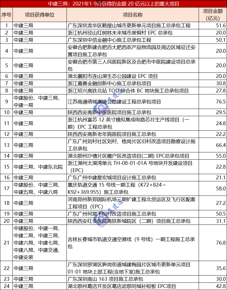 中建三局今年前三季度累计收获重大项目 24 项,项目总合同额超 910 亿元。