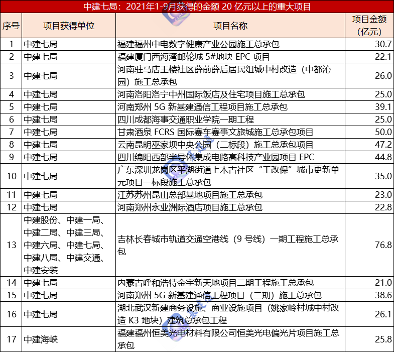 中建七局在重大项目的承揽上,也有出色的表现,17 项 20 亿+大单、累计 579 亿合同额收入囊中,为年度经营业绩奠定了千亿基石。