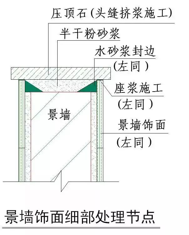 5)灌水泥砂浆时要求成45度方向灌实,所有腰线顶面板及压顶板严禁半干粉砂浆铺板,必须使用流动的水泥砂浆铺贴面板。