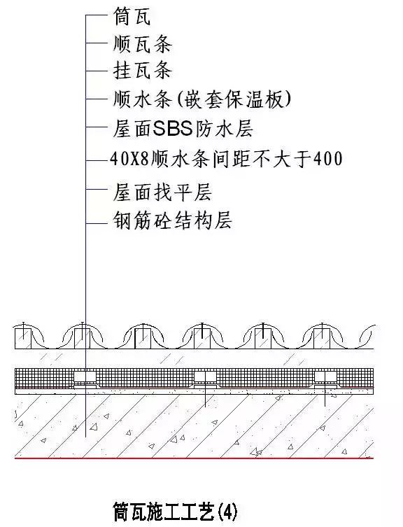 1)施工工序依次为:混凝土结构层-找平层-40X8顺水条-防水层-顺水条(嵌套保温板)-挂瓦条-顺瓦条-筒瓦。