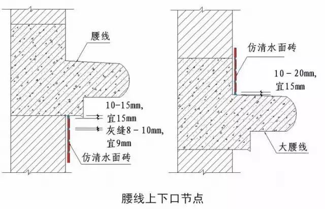 面砖在粘贴时,在面砖与上腰线之间留出10-15mm(宜15mm),线条上涂料跟下5mm,面砖与下腰线之间留出10-20mm(宜15mm)。