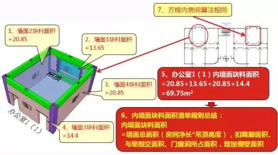 很显然,这里高度扣除了踢脚高度,也就是说,计算墙面块了面积是要扣除踢脚的。