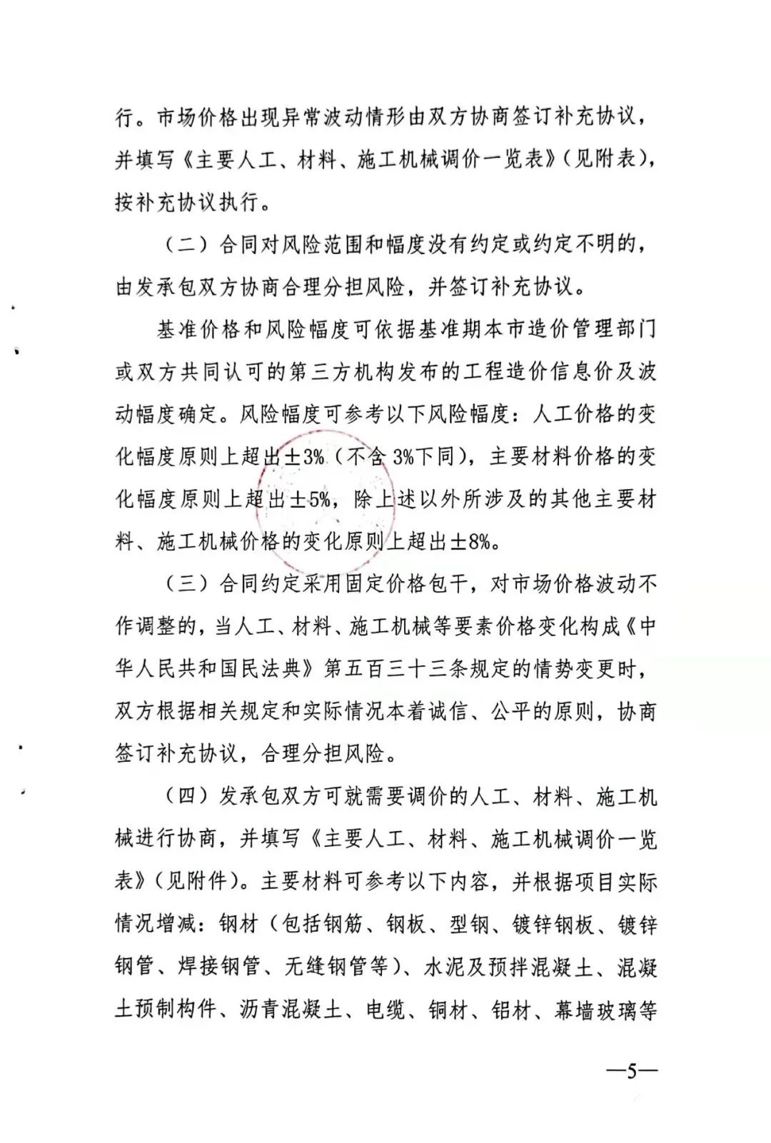 (二)若合同中约定不调整建筑材料价格或对建筑材料计价风险无约定或约定无限风险时,当主要建筑材料价格涨跌幅度超过5%时,造成合同一方继续履约困难的,发承包双方应本着实事求是和公平公正的原则,协商解决或按照《建设工程工程量清单计价规范》(GB50500-2013)9.8.2条规定执行。