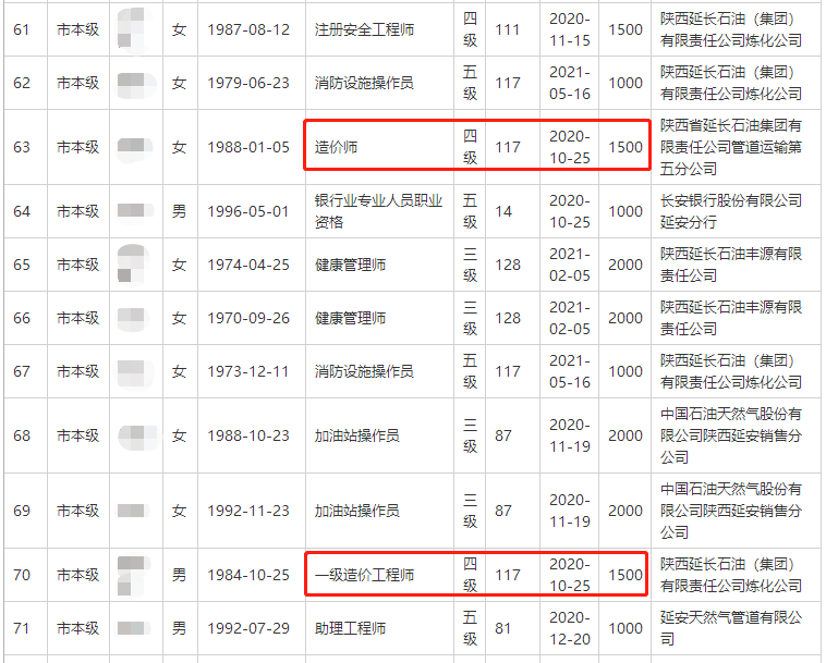 建造师、造价师、监理师、勘察设计工程师等均在对应列表中,其中一级对应工程师,可领1500元;二级对应助理工程师,可领1000元。