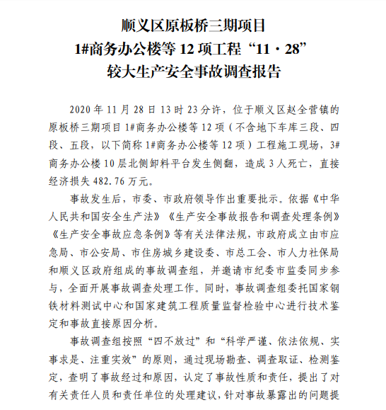 2020年11月28日13时23分许,位于顺义区赵全营镇的原板桥三期项目1#商务办公楼等12项工程施工现场,3#商务办公楼10层北侧卸料平台发生侧翻,造成3人死亡。