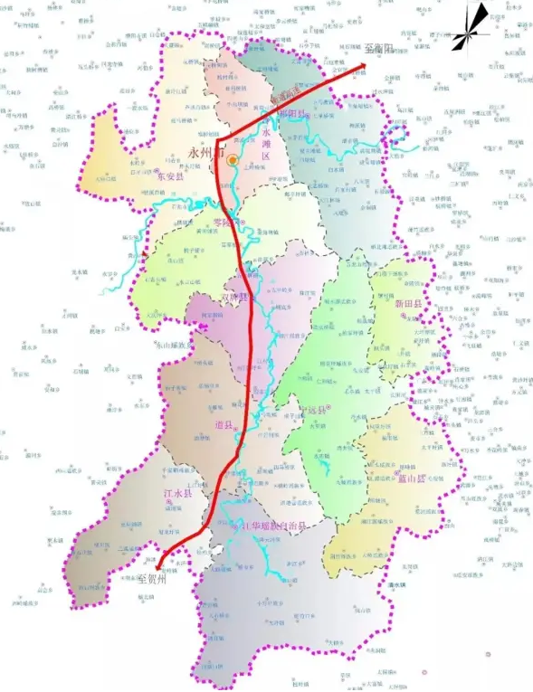 项目北起永州市冷水滩区,顺接衡永高速公路,与已建成的二广、泉南高速公路相交、与拟建的永清高速相交,往南经东安县、零陵区,与规划的零道高速公路对接。