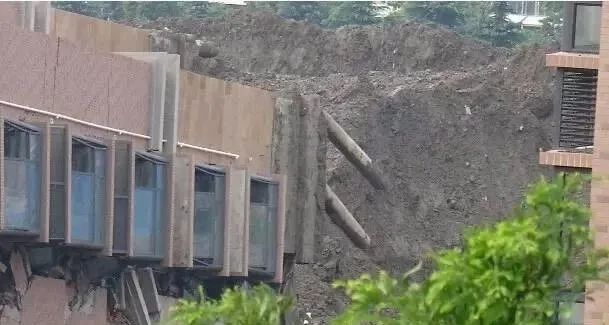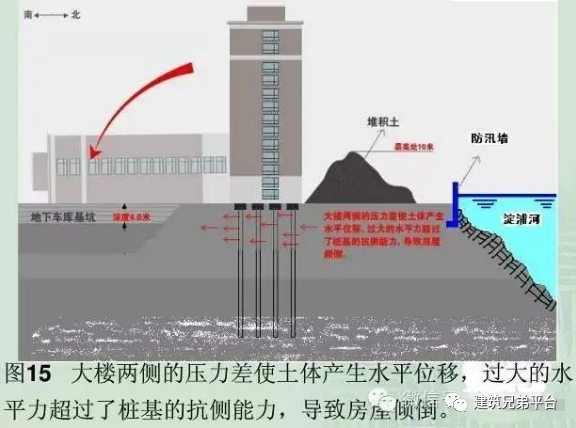 紧贴7号楼北侧,在短时间内堆土过高,最高处达10米左右;与此同时,紧邻7号楼南侧的地下车库基坑正在开挖,开挖深度4.6米,大楼两侧的压力差使土体产生水平位移,过大的水平力超过了桩基的抗侧能力,导致房屋倾倒。