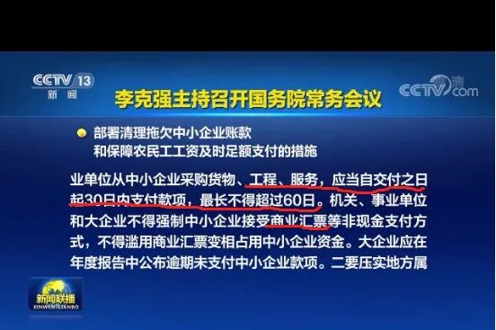 会议指出,治理拖欠中小企业账款,直接涉及推进市场化、法治化、国际化营商环境建设。今年以来,受国内外复杂严峻环境和疫情多点散发等因素影响,中小企业应收账款增长较快、被拖欠情况增多。要贯彻党中央、国务院部署,按照保市场主体的要求,依法依规加大对拖欠中小企业账款的整治力度。一要严格执行《保障中小企业款项支付条例》,整治滥用市场优势地位恶意拖欠账款行为。机关、事业单位从中小企业采购货物、工程、服务,应当自货物、工程、服务交付之日起30日内支付款项,最长不得超过60日。机关、事业单位和大企业不得强制中小企业接受商业汇票等非现金支付方式,不得滥用商业汇票变相占用中小企业资金。大企业应在年度报告中向社会公布逾期未支付的中小企业款项。二要压实地方属地和部门监管责任,加强审计监督,对机关、事业单位、国有大企业拖欠中小企业账款要依法查处并严肃问责,严重失信的要公开曝光。三要强化长效机制建设,健全建设工程价款结算相关制度,提高工程进度款支付比例。全面推行保函(保险)替代保证金。会议强调,要抓紧制定完善《优化营商环境条例》等法规的相关配套政策,从根本上减少和防范拖欠账款问题。