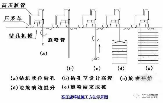高压旋喷桩所用的材料亦为水泥浆,它是利用高压经过旋转的喷嘴将水泥浆喷入土层与土体混合形成水泥土加固体,相互搭接形成排桩,用来挡土和止水。
