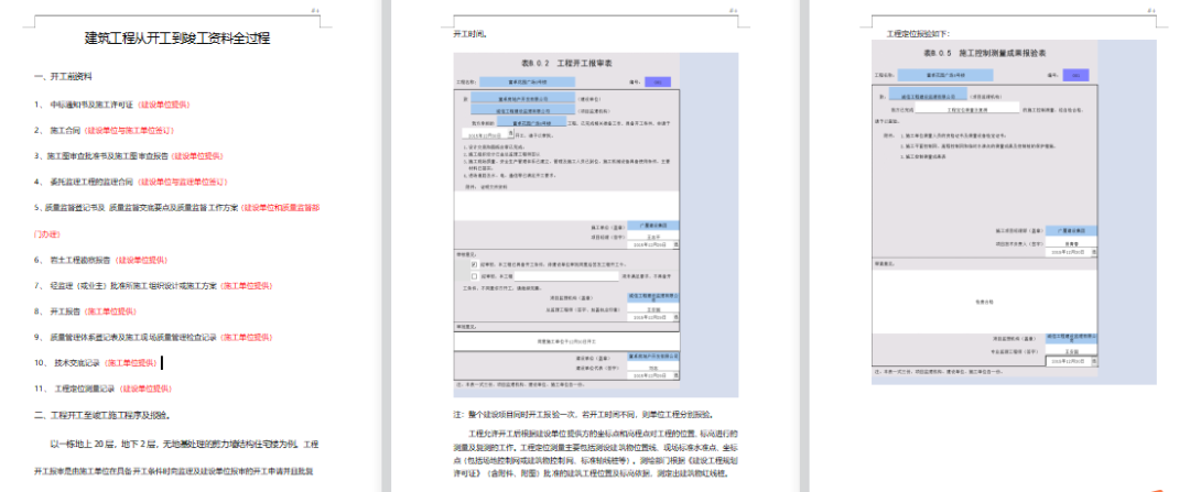 “任何一个项目从施工到竣工都是需要有完善的施工资料和流程,具体所需要的资料包括开工前资料、质量验收资料、实验资料、材料、产品、钩配件等合格证资料、施工过程资料、必要时应增补的咨询、竣工资料、建筑工程质量监督管理存档资料。