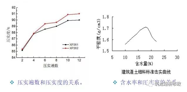 压实次数~压实度、含水量~压实度关系曲线。