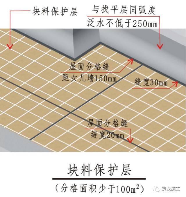 5、屋面找平层(保护层)应设置分格缝,分格缝间距宜4.0-6.0m,缝宽20mm,女儿墙周边分格缝缝宽为30mm。